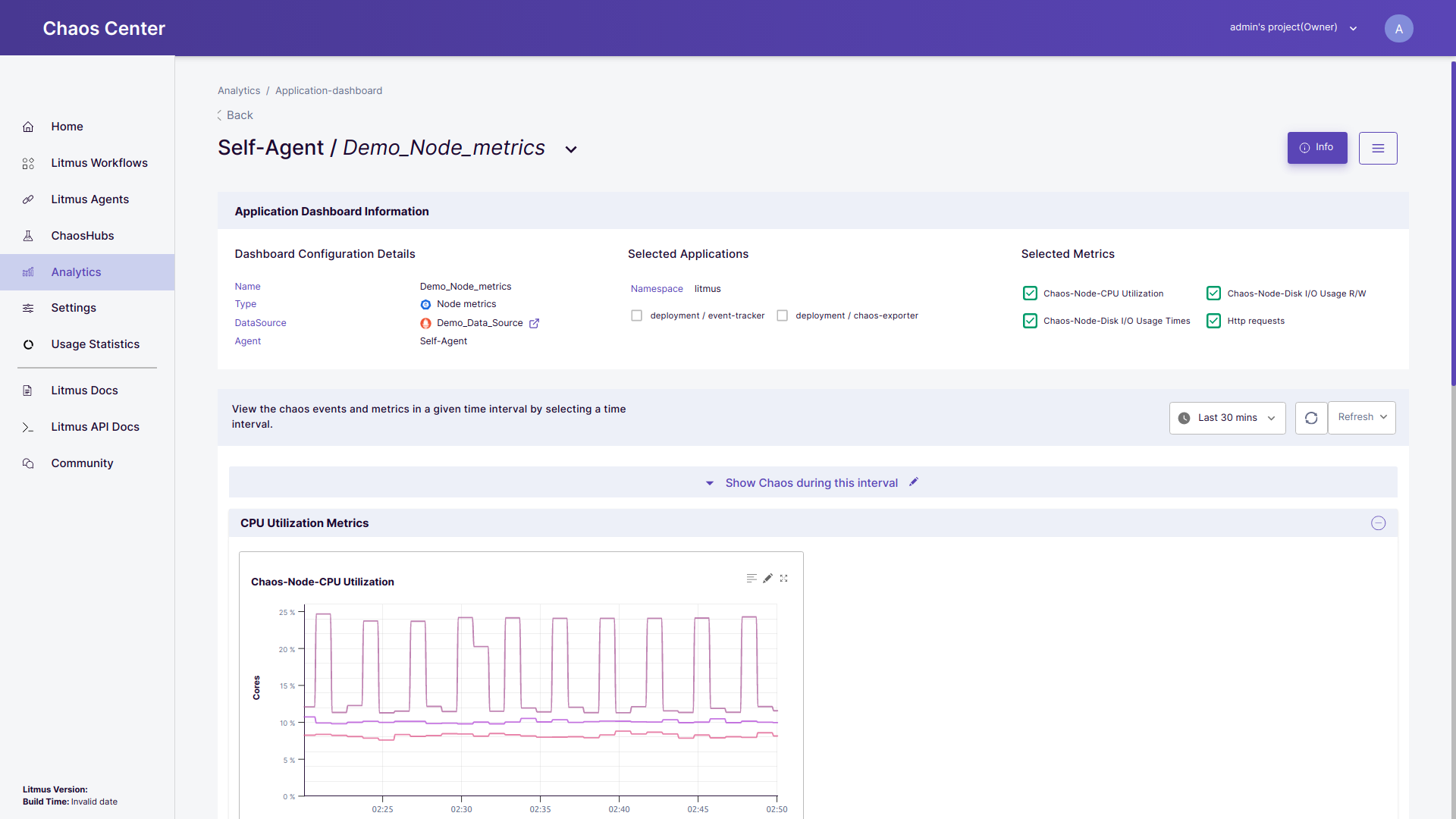 • Dashboard Info: All the dashboard meta-data (name, type, data source, chaos delegate ), selected applications and selected panels are displayed in this selection. To check on the data source connected with the dashboard click on the attached data source link. You may select/deselect the items listed in the selected applications and selected panels field to visualize the appropriate data.